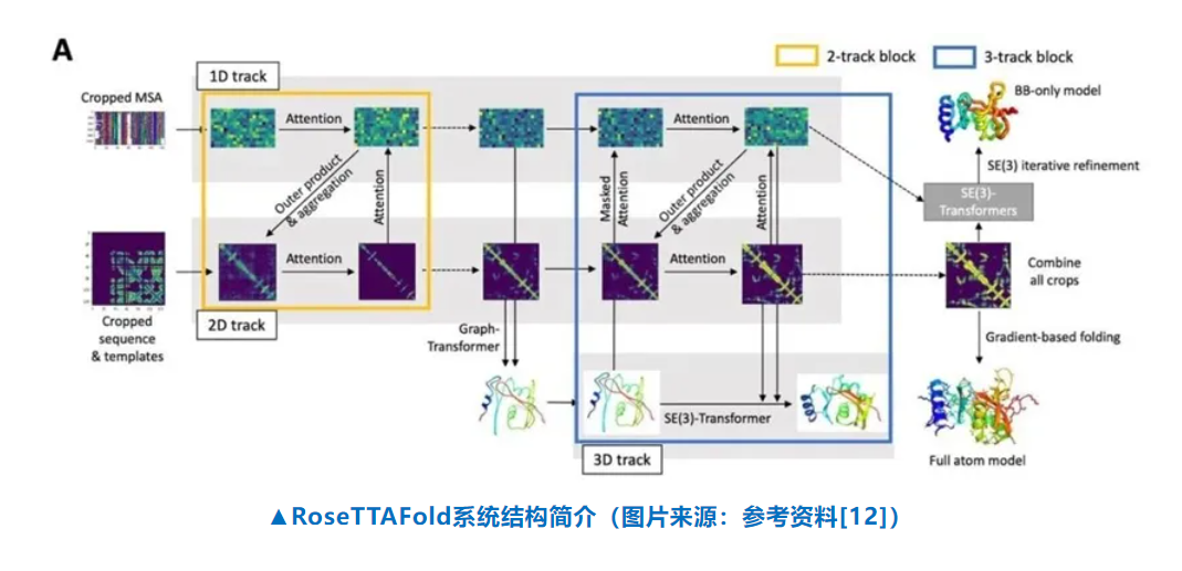 2003年,Baker的團隊設計出了第一個原本并不存在于自然界中的蛋白質,它被命名為Top7。這當然是一個重要突破,但卻沒有開辟一個嶄新的時代。Baker實驗室的成員開玩笑說Top7只是一塊從熱力學角度上看很穩定的“石頭”。因為他們從頭設計出的這個蛋白質雖然折疊成了研究人員們想要它折疊的模樣,但不具有任何功能。7年后,Baker的一名博士后研究員做出了改進。他將抗體的一部分連接到了人造蛋白上,使人造蛋白首度具有了功能:新合成的蛋白能識別流感病毒,有望成為一種新的藥物,但這多少有些“作弊”的意思,畢竟最重要的那部分來自天然的抗體。接下來的幾年時間,Baker的團隊對Rosetta進行了更多的優化。如今,Baker的實驗室,以及他的合作伙伴們已能設計出多種不同的蛋白,有朝一日,人類完全獲得“上帝之手”的能力將不再是夢想。不過到目前,從頭設計蛋白依然是一個不斷試錯的工作,需要大量的資源投入。以設計結合蛋白為例,從流程上看,科學家會首先用Rosetta模擬出所感興趣蛋白表面上的一個“口袋”,然后再設計出大量不同的螺旋結構,形成穩定骨架。這些骨架上含有一些特定的氨基酸,有可能會與“口袋”進行完美的契合。這個工作就像是在一把鑰匙上不斷打磨,最終使其完美地對應一把鎖。隨后,研究人員們會根據設計合成所要的DNA序列,將其引入細菌細胞,期望它們能夠產生所需要的蛋白。獲取這些蛋白后,他們還會做兩個測試:評估這些蛋白是否能如預期般折疊,以及折疊后的蛋白是否能如預期般結合特定蛋白。通常來講,人工設計的蛋白極少能同時滿足這兩個條件。而那些脫穎而出的蛋白,則會成為新一輪設計與篩選的起點,直至獲得最佳的構象。在2018年以前,Baker及其團隊開發的Rosetta在蛋白質結構預測領域完全沒有對手。而那一年,AlphaFold的出現令Baker嗅到了危機。盡管18年的蛋白質結構預測競賽依然是Rosetta拔得頭籌,但首次亮相就獲得了第二名的AlphaFold令Baker見識到了機器學習的過人之處。于是,他要求團隊緊跟時代的風向,加緊研究機器學習。Baker的預感沒有錯,在2020年的競賽中,第二代AlphaFold擊敗了Rosetta,一舉成名。不過,Baker率領著團隊很快就追趕了上來。2021年7月15日,當DeepMind公司在《自然》雜志上發表論文,公開了“AlphaFold2”的源代碼,并且詳細描述了它的設計框架和訓練方法時,Baker的團隊也于《科學》雜志上介紹了其開發的RoseTTAFold算法。RoseTTAFold的神經網絡能夠同時考慮蛋白序列的模式、蛋白中不同氨基酸之間的相互作用,以及蛋白質可能出現的3D結構。在這個系統中,一維、二維和三維的信息能夠相互交流,讓神經網絡綜合所有信息,決定蛋白質的化學組成部分和它折疊產生的結構之間的關系。